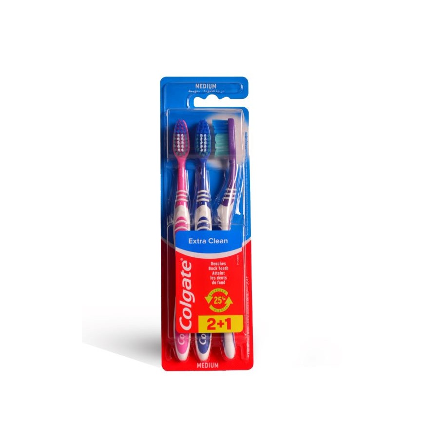 Get cleaner teeth with the Colgate® Extra Clean toothbrush. This manual toothbrush features specially designed circular bristles to help remove stains, and a cheek and tongue cleaner for more effective bacteria removal than brushing with a traditional smooth bristle toothbrush.